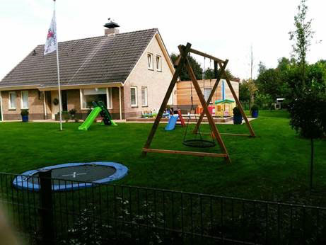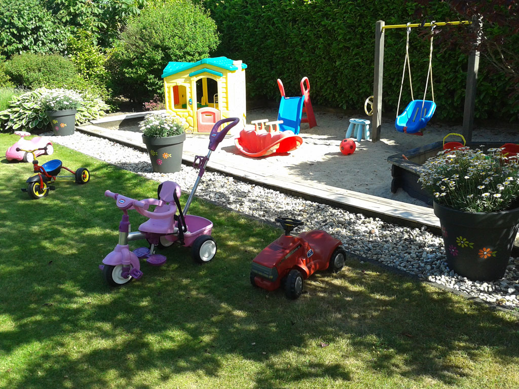 De tuin biedt volop mogelijkheden om actief bezig te zijn: een groot grasveld, zandbak, speelhuisje, glijbaan, wipwap en rijdend speelgoed zoals driewielers, loopauto’s en een step.