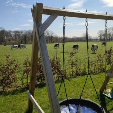 Voor de opvang hebben wij onze garage omgebouwd tot opvanglocatie. Er kan gebruik worden gemaakt van een eigen ingang. De buitenruimte is in onze ruime tuin. Hier hebben wij tijdens de opvanguren een stuk afgesloten, zodat er te alle tijden zicht is op de kinderen. Hier kunnen ze lekker spelen in de zandbak of helpen in de moestuin. Daarnaast zullen we ook vaak de overalletjes aandoen om te gaan kijken bij de kalfjes en de koeien op het bedrijf of om te gaan wandelen in het naastgelegen bos.