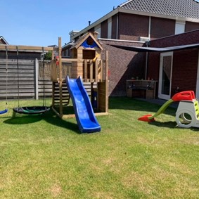 Omdat ik in een kindvriendelijke buurt woon kunnen wij naast onze ruime achtertuin met speeltoestellen ook gebruik maken van de speeltuintjes bij ons om de hoek.