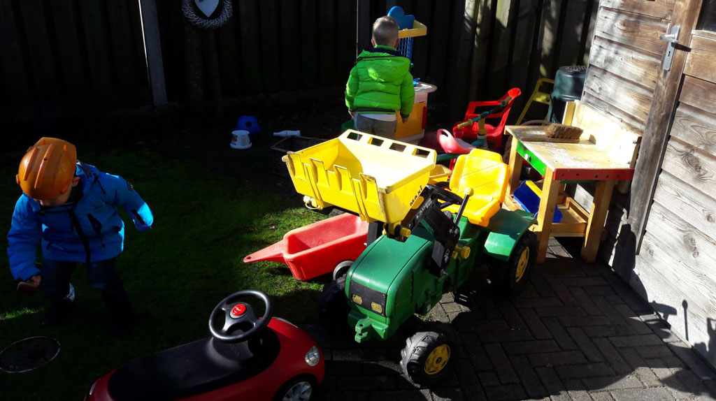 We wonen in een rustige straat met een besloten tuin, waar volop gespeeld wordt met trekkers, keukentjes en meer. In de buurt zijn ook speeltuintjes waar we regelmatig naartoe wandelen.