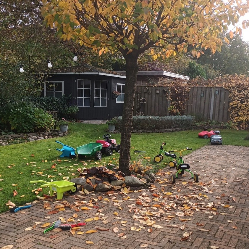 In de tuin hebben we een speelhuisje, een zandbak, schommels en ander speelgoed waarmee de kinderen zich heerlijk kunnen vermaken. Buiten ontdekken we ook veel seizoenen: bladeren zoeken in de herfst, waterpret in de zomer, en in de lente kijken we wat er allemaal groeit en bloeit.