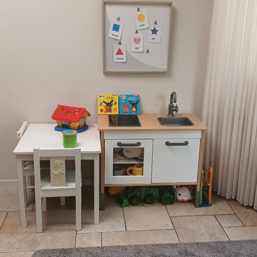 Binnen hebben we veel ruimte om te spelen, te knutselen, te bouwen, te lezen of gewoon even fijn te zitten met een boekje. Ik vind het belangrijk dat kinderen kunnen kiezen wat bij hen past. Het ene kind geniet van creatief bezig zijn, het andere wil juist graag ontdekken, rollen, bouwen of samen spelen. Alles mag, niets moet.