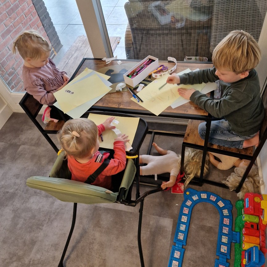 Mijn opvang bevindt zich in een gezellige, speciaal ingerichte ruimte in huis. Hier kunnen kinderen naar hartenlust knutselen, bouwen, tekenen of spelen met poppen en ander speelgoed. Alles is overzichtelijk en kindvriendelijk ingericht, zodat elk kind zich vrij en veilig voelt. Buiten hebben we een afgesloten tuin met een trampoline en een zandbak. Bij mooi weer spelen we hier veel, en soms gaan we naar de speeltuin die letterlijk aan de overkant van de straat ligt! Zo krijgen kinderen genoeg frisse lucht en beweging.