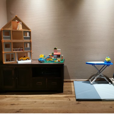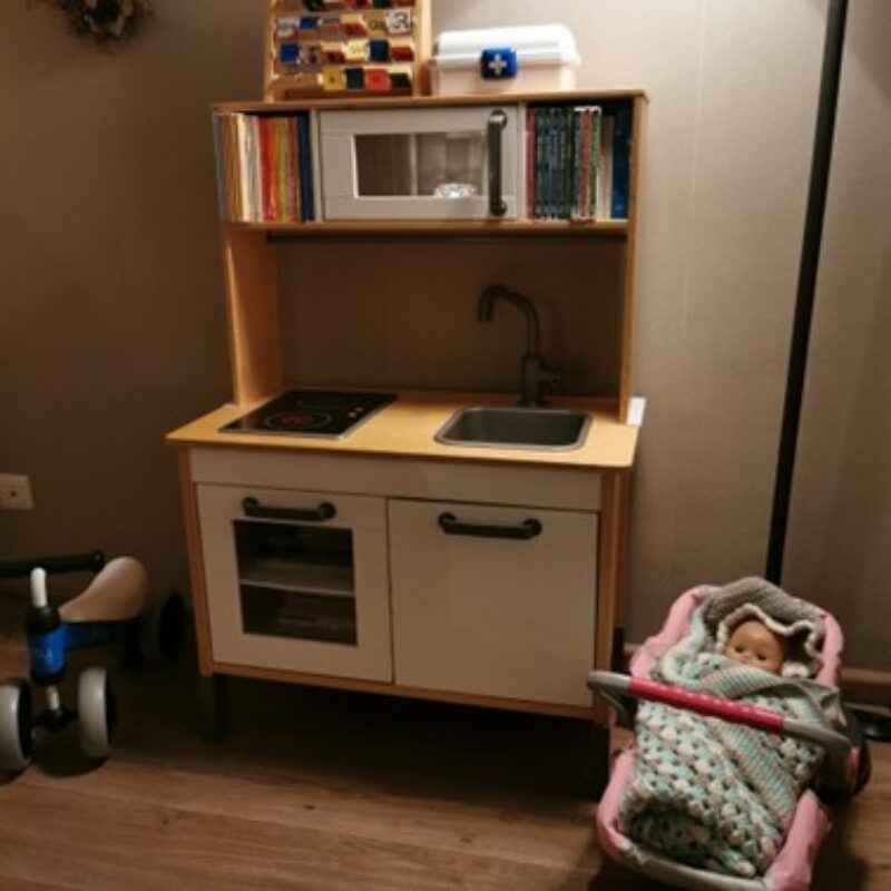 Binnen spelen de kinderen vooral in de woonkamer met Duplo, puzzels, poppen, autootjes enzovoorts. Genoeg speelgoed voor verschillende leeftijden. Buiten hebben we een ruime tuin met een trampoline, schommel, buitenkeukentje, speelhuisje en los speelgoed als fietsjes en stepjes.